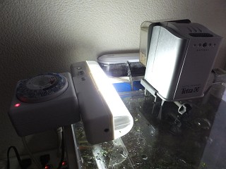 (2)照明&照明用タイマー・・・ 家の中で飼うなどで、外の光が入らない場合は、照明をつけてあげると良いです。 と言っても、大そうなものでなくて、ミニ蛍光灯でも十分に明るいです。 また、照明用タイマーは、リーベックス社のプログラムタイマー(1000円〜2000円程度)を使っていますが、自動で照明がON/OFF できるので、長期の不在時で、家中の雨戸を閉めてしまっていても、明りがとれます。 こんな感じでセッティングしています。 ↓ ミニ蛍光灯とプログラムタイマーで照明を確保、さらに給餌機で長期の不在の対策を実施しています