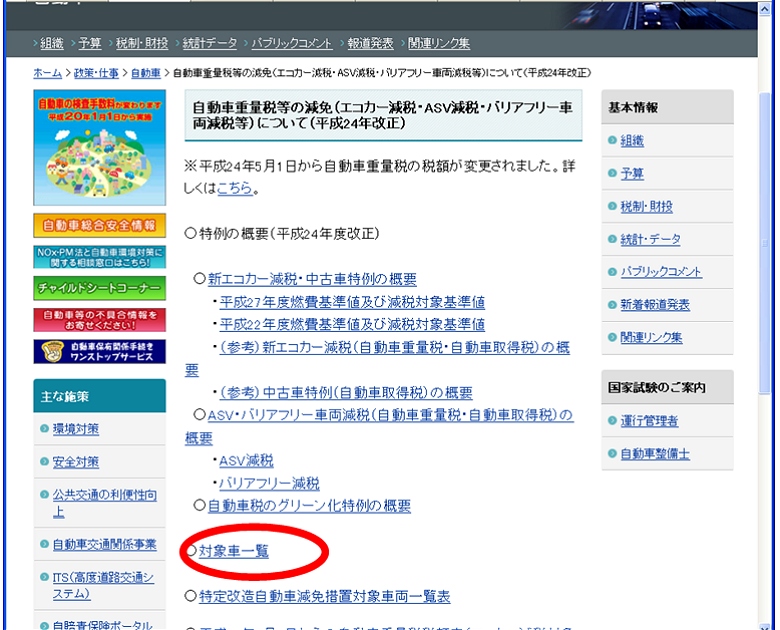 平成24年5月1日から平成27年4月30日まで、「新エコカー減税」ということで、エコな自動車に関する税金が安くなっています。