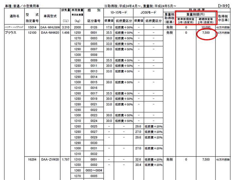 ちょっと他の車を見てみましょう。。。 例えば、トヨタのプリウスの場合、7,500 と書いてありますので、重量税が7,500円で良いことになります。