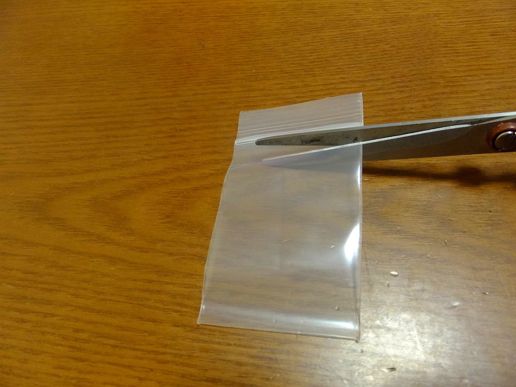 まずは、チャック袋を切ります。底から65mmの高さでカットします。