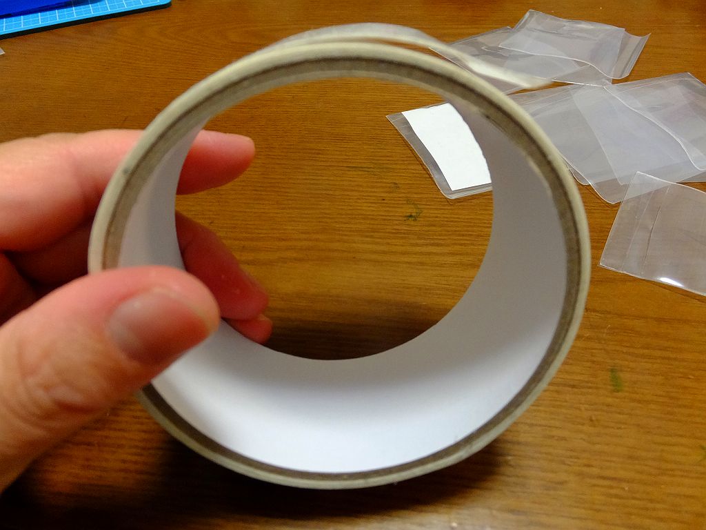 剥離紙がついているので白く見えますが、透明の両面テープです。