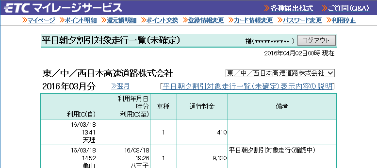 ・平日朝夕割引を利用すると、ETCマイレージサービスのページでは、上記のように表示されます。すぐにマイレージが還元されるわけでは無く、毎月20日に前月分が確定します。(下のイメージは過去の制度での表示です。現在とは表記が異なります)
