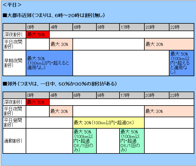 | 割引適用時間 | 平日の朝6〜9時と夕方17〜20時に料金所を通過すれば良い。 朝・夕の2回、割引が適用される。 ※同じ時間帯に複数回走行した場合、2回目以降の走行には割引は適用されない。利用回数にもカウントされない。 |