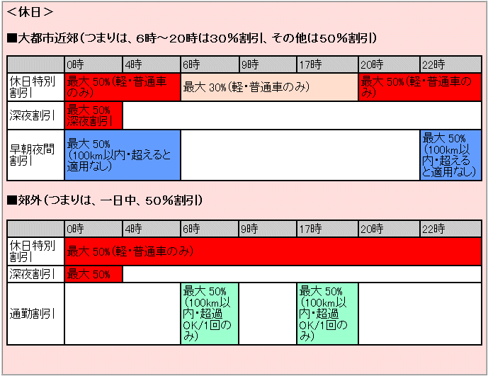 | A休日割引 | 最大30%(軽自動車等・普通車のみ) | ||||||