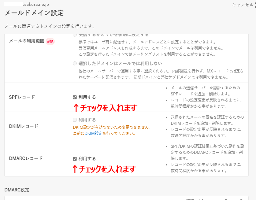 <メールドメイン設定>の画面で「SPFレコード」「DKIMレコード」「DMARCレコード」の □利用する をチェックします。