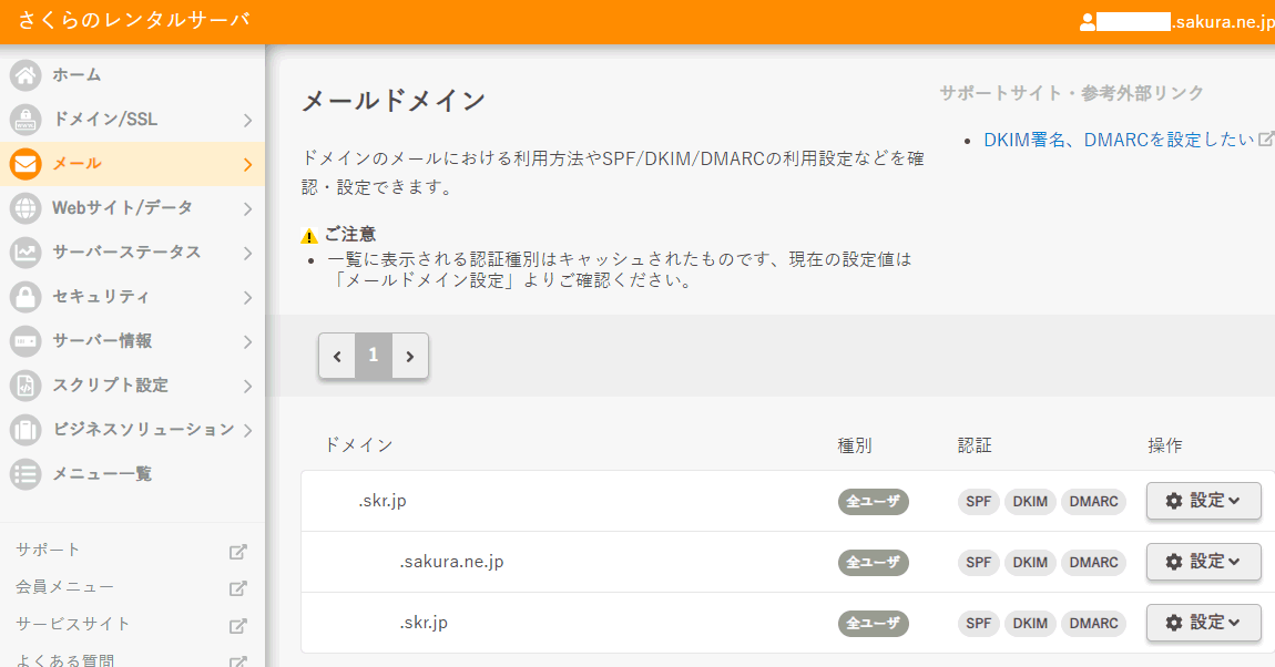 と、言っても、さくらインターネットではかなり簡単に設定ができるようになっており、さくらインターネットの「サーバコントロールパネル」にログインをして、<ドメイン設定>で、SPFレコード、DKIMレコード、DMARCレコードを「利用する」という設定にチェックを入れることで対処できます。(これまでは、SFPレコードの設定だけでよかったのですが・・・)