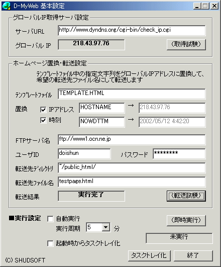 ●テンプレートファイル・置換(IPアドレス、時刻)は、デフォルト設定でOKです ●FTPサーバ名・ユーザID.パスワード・転送先ディレクトリは、ホームページの登録情報に基づいて正しく設定してください ●転送先ファイル名は、問題が無ければデフォルト設定でOKです ●[転送試験] ボタンを押下し、「実行完了」が表示されれば成功です 成功しない場合は、設定内容が間違っているか、サーバ側で書き込みができない状態である可能性があります。一度、ほかの手法(FTPコマンドやFTPクライアントプログラム)を用いて接続、ファイルの転送ができるか試みてください。 実行設定 ●一定周期で自動的に実行したい場合は、「自動実行」にチェックをして、「実行周期」を設定します ●起動しても、画面に表示せずタスクトレイにのみ表示する場合は「起動時からタスクトレイ化」をチェックします |
