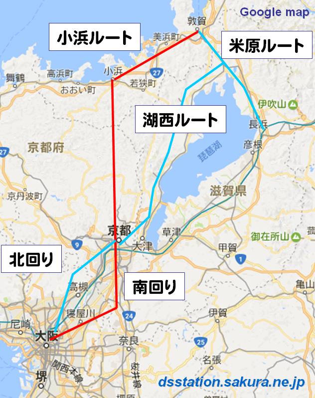 小浜ルート・・・小浜まで日本海側を進み、京都へ南下するルート